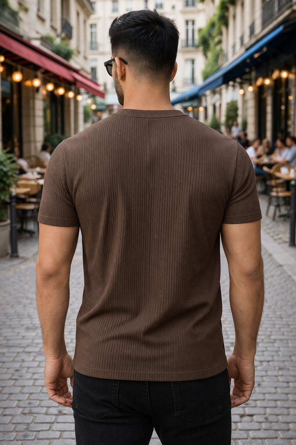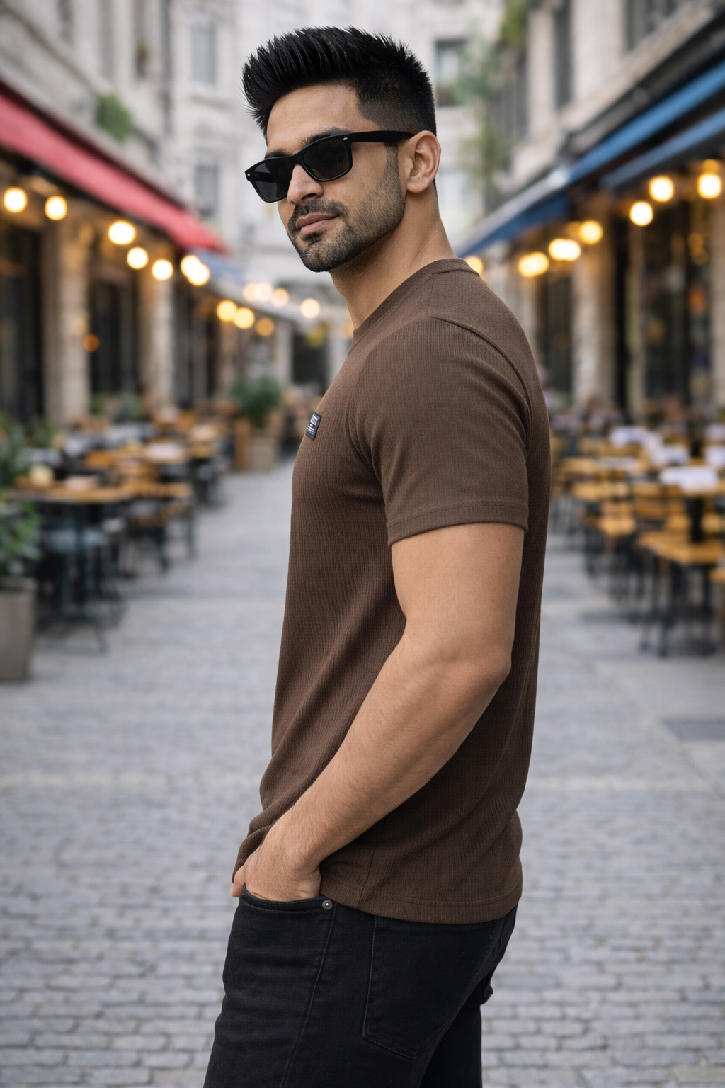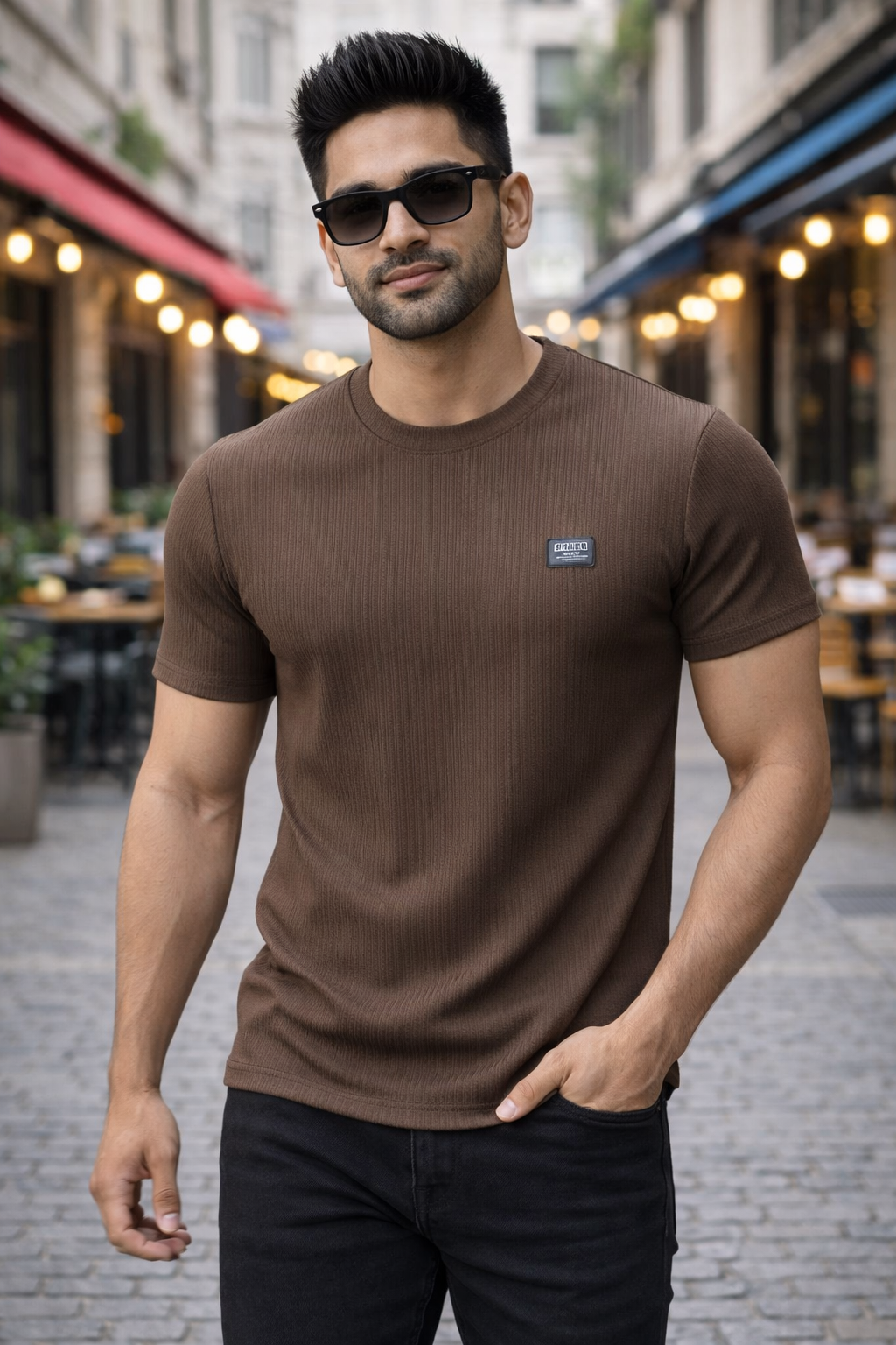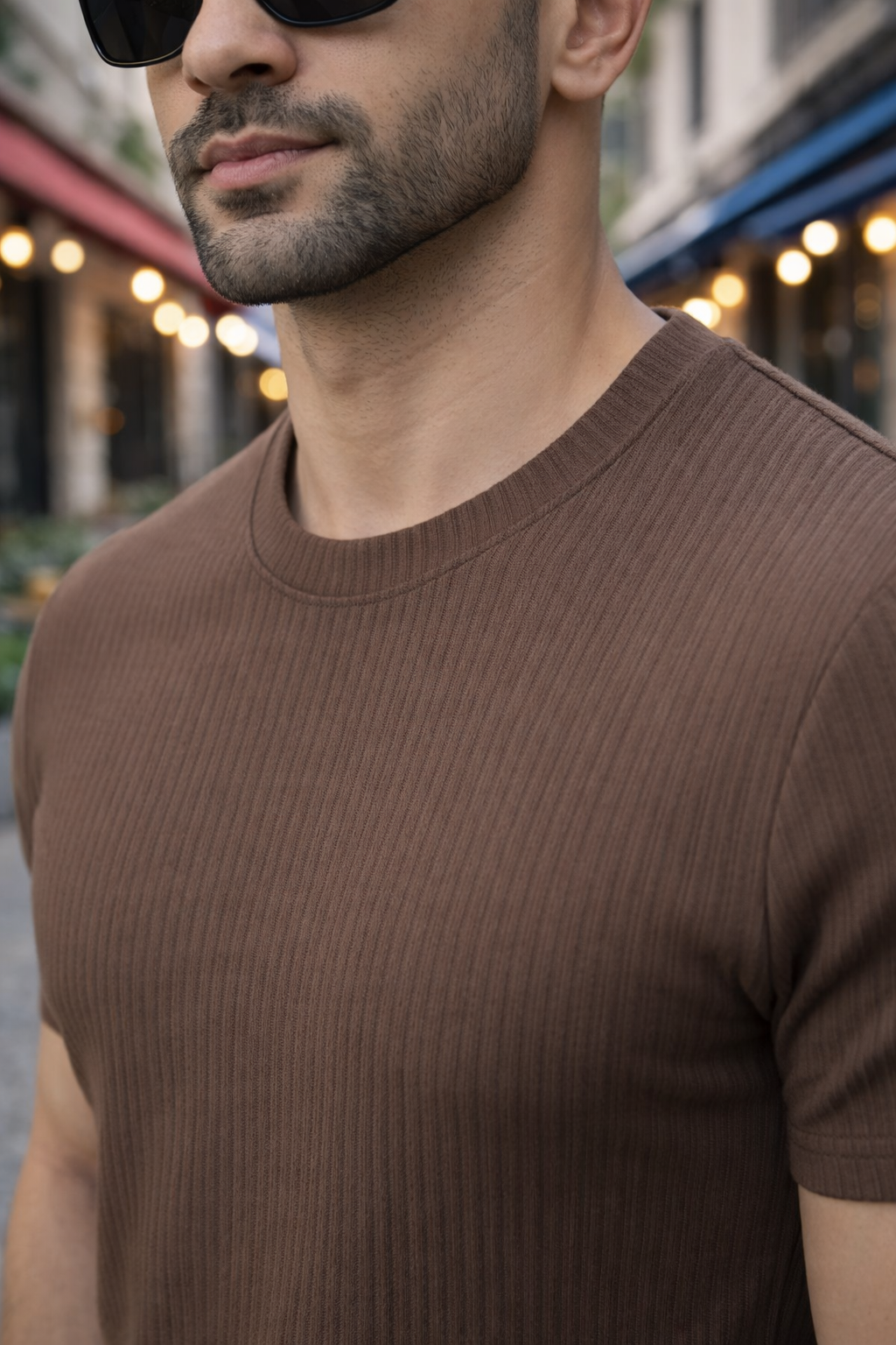 Upgrade your everyday wardrobe with this premium Chocolate Brown Ribbed Texture T-Shirt from Arospar (Defined by Quality). Designed with a rich vertical textured pattern, this T-shirt delivers a modern, classy look that stands out from regular plain tees. Perfect for casual outings, café looks, and street-style fashion.