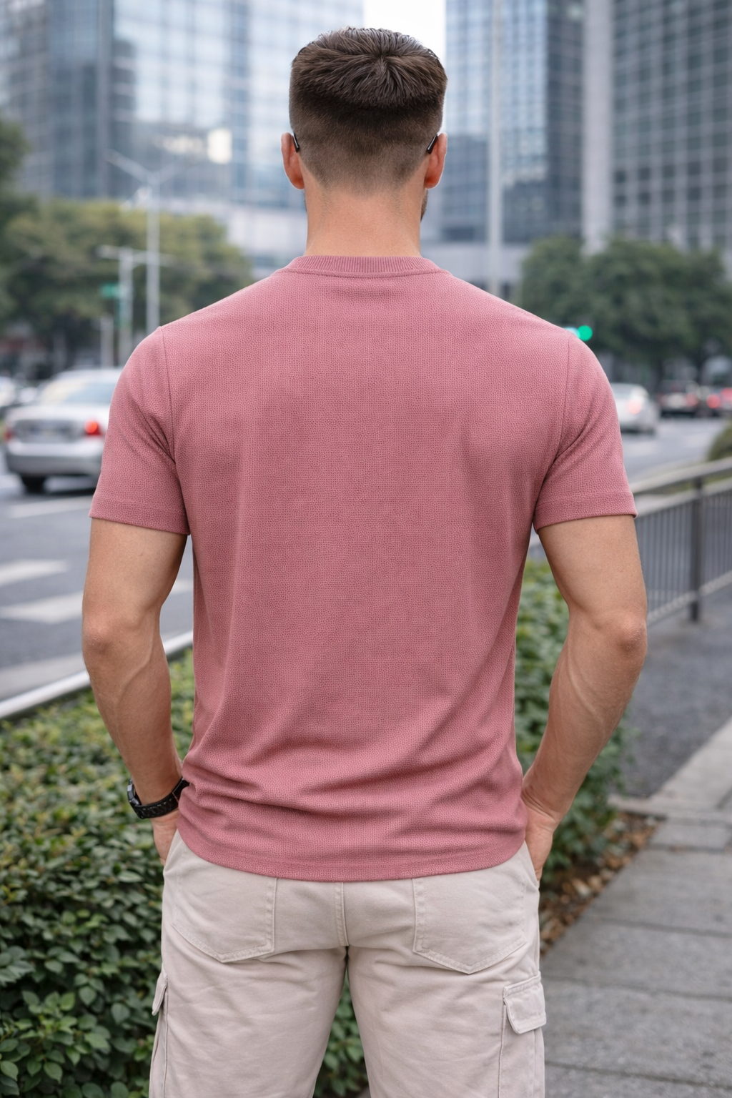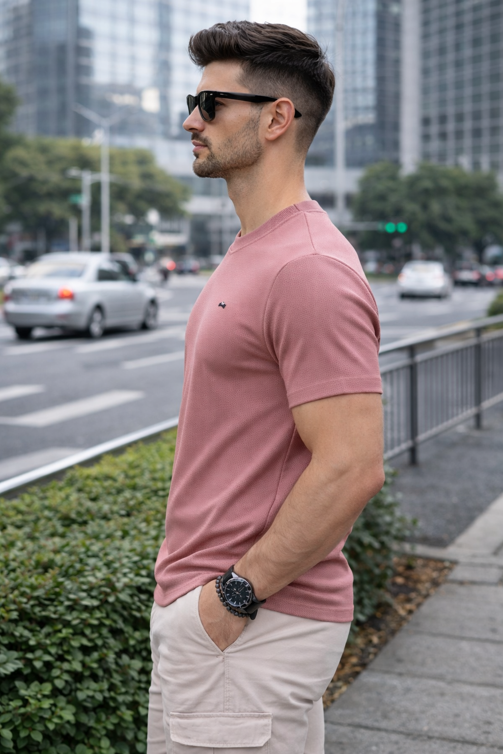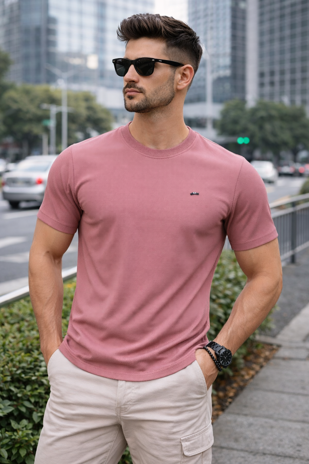 Add a soft yet stylish touch to your wardrobe with the Arospar Premium Textured Dusty Pink T-Shirt. Designed with a refined micro textured fabric, this t-shirt offers a smooth yet detailed surface that enhances both comfort and appearance.