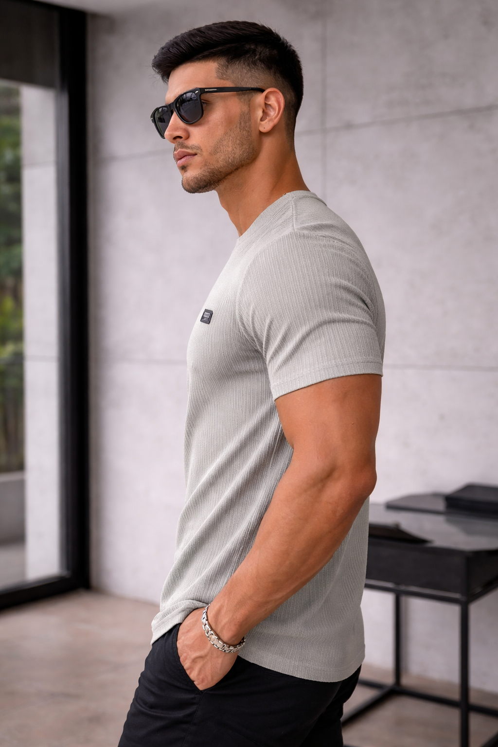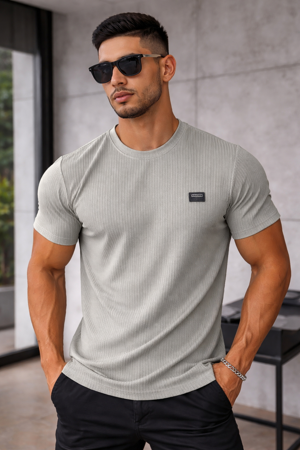 The slim fit design enhances body shape, while the breathable fabric ensures comfort throughout the day. Finished with a minimal chest patch branding, this t-shirt is perfect for casual wear and a clean, stylish appearance.
